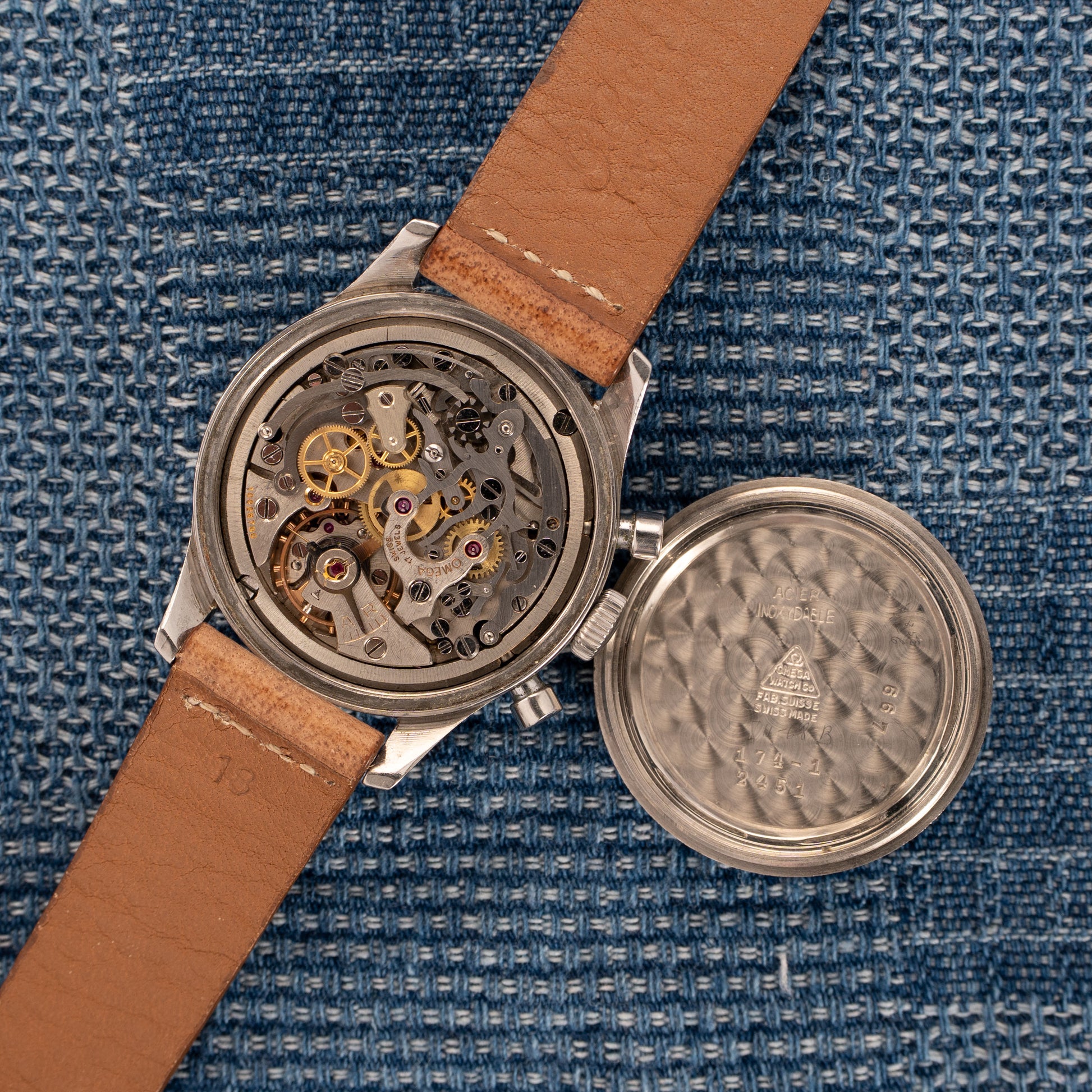 Dial: Original argentè with applied steel indexes and hands, three counters and chronograph with 30- minute and 12-hour recorders.