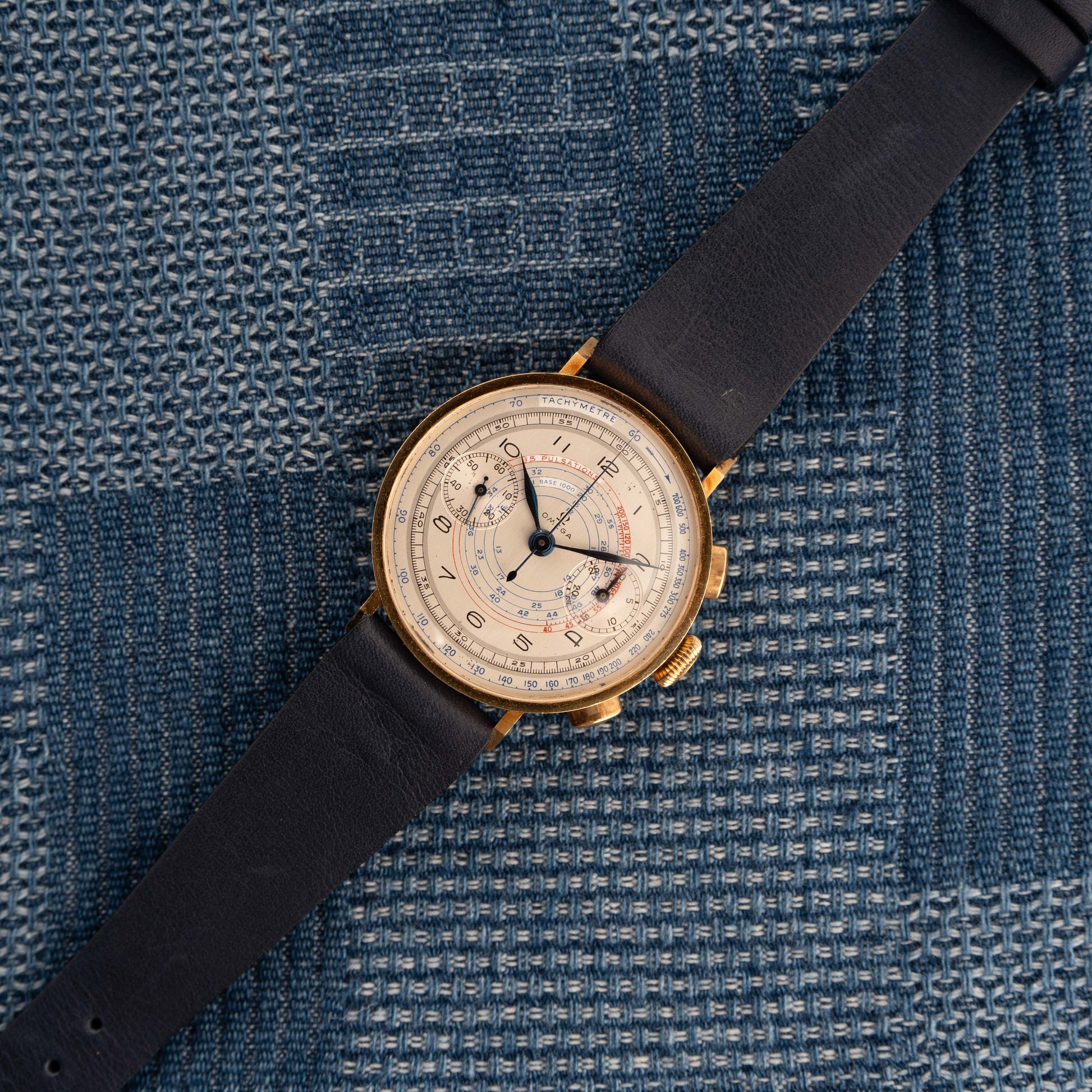 Dial: Original argentè color, arabics numerals indexes and "Feuille" black hands and centre seconds. multi-scale in red and blu, a very rare configuration.