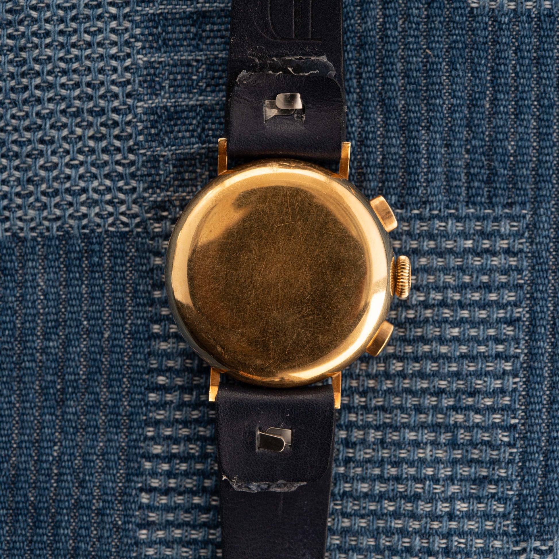 Experience this Omega chronograph, driven by the renowned 33.3 movement from Lemania. This distinctive and exceedingly rare timepiece showcases an oversized case crafted from 18 kt yellow gold, meticulously fashioned and presented in impeccable condition. The watch comprises a three-part case, a snap-on back and crown, an "Olive" shaped pusher, and fixed lugs, all encased within a flat bezel. The dial is a marvel of design, featuring a remarkable three-tone color scheme, "Arabic" numerals, and a multi-scale layout, seamlessly merging impeccable aesthetics with practical sophistication. This Omega exemplifies the artistry of fine watchmaking, encapsulating elegance and precision in every aspect.