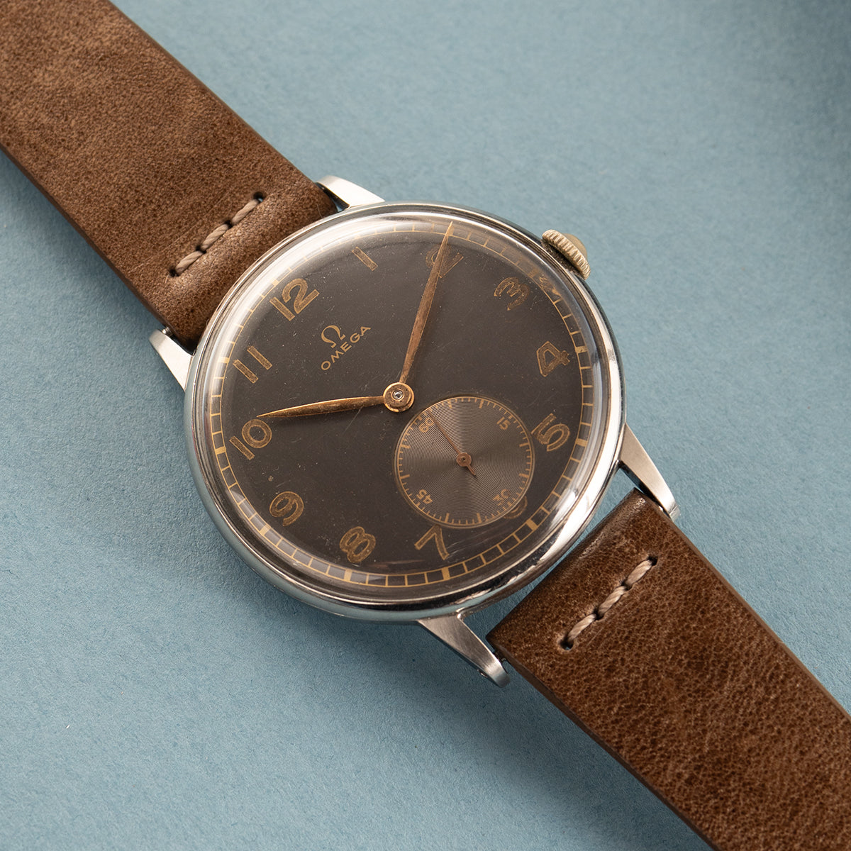 Unusual and very rare, produced in very few pieces, with a dish stainless steel case in two parts so called Mono-blocco", snap on back, steel crown and incredible grey color dial "arabics" numerals indexes and rosè gold hands.