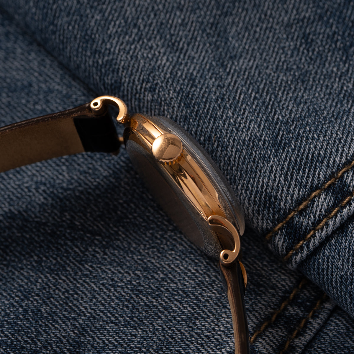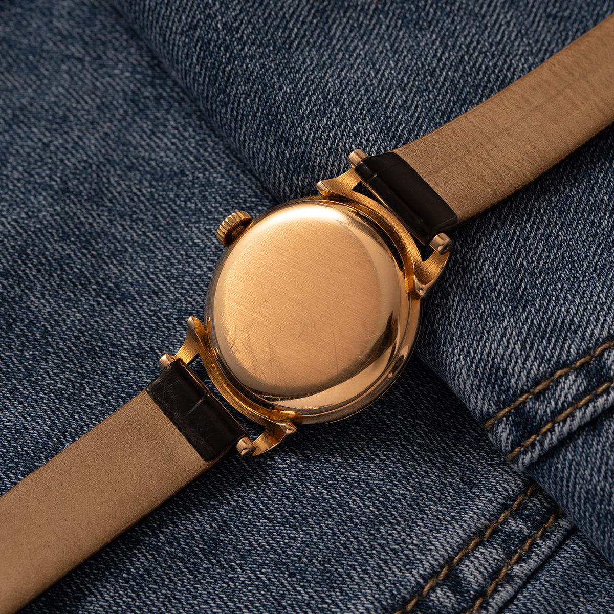 Dial: original argentè color, black graphics, seconds at six o clock with applied baton gold indexes and "Dauphine" gold hands, personalized by Gobbi Milano.