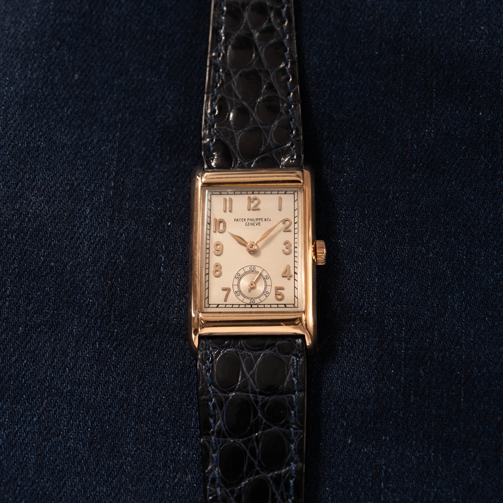 Unusual and well preserved rectangular case in 18 kt rose gold,in two parts, snap on back and large curved crystal, with fantastic argentè color dial and "Arabics" numerals indexes and rose gold hands.