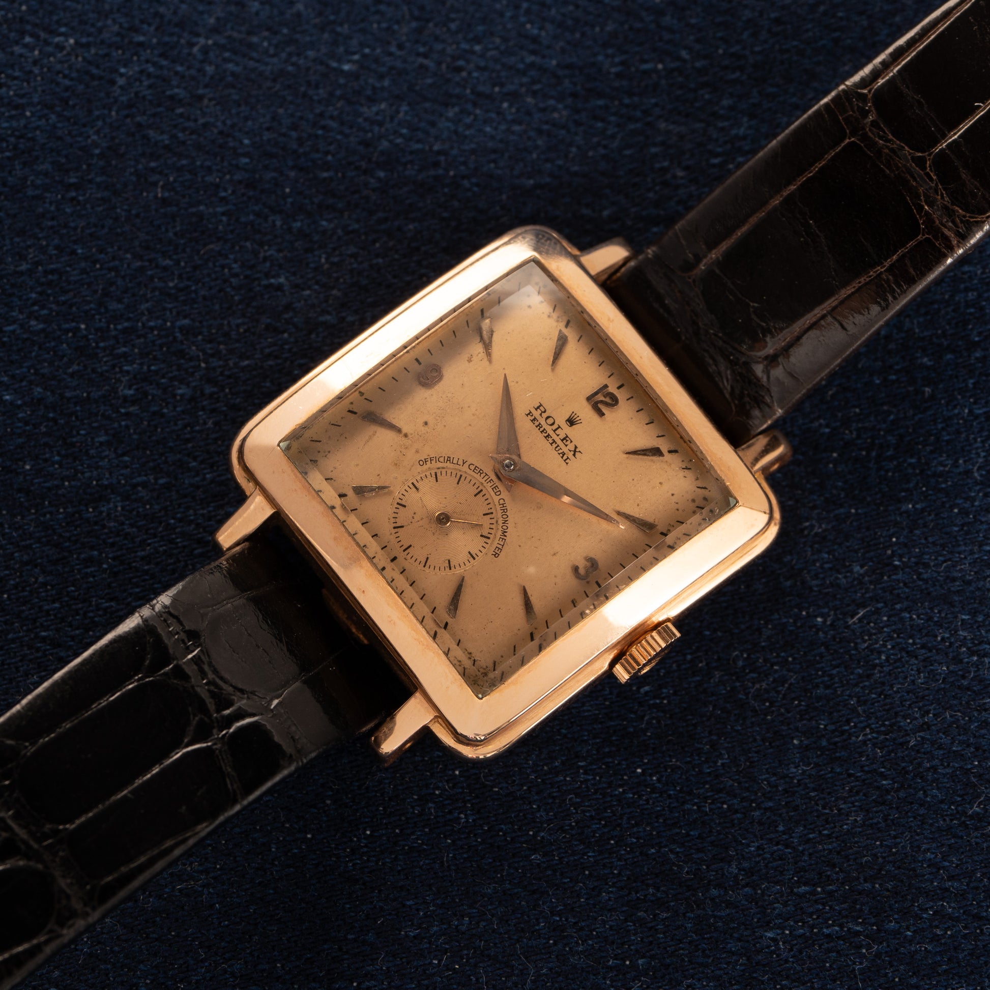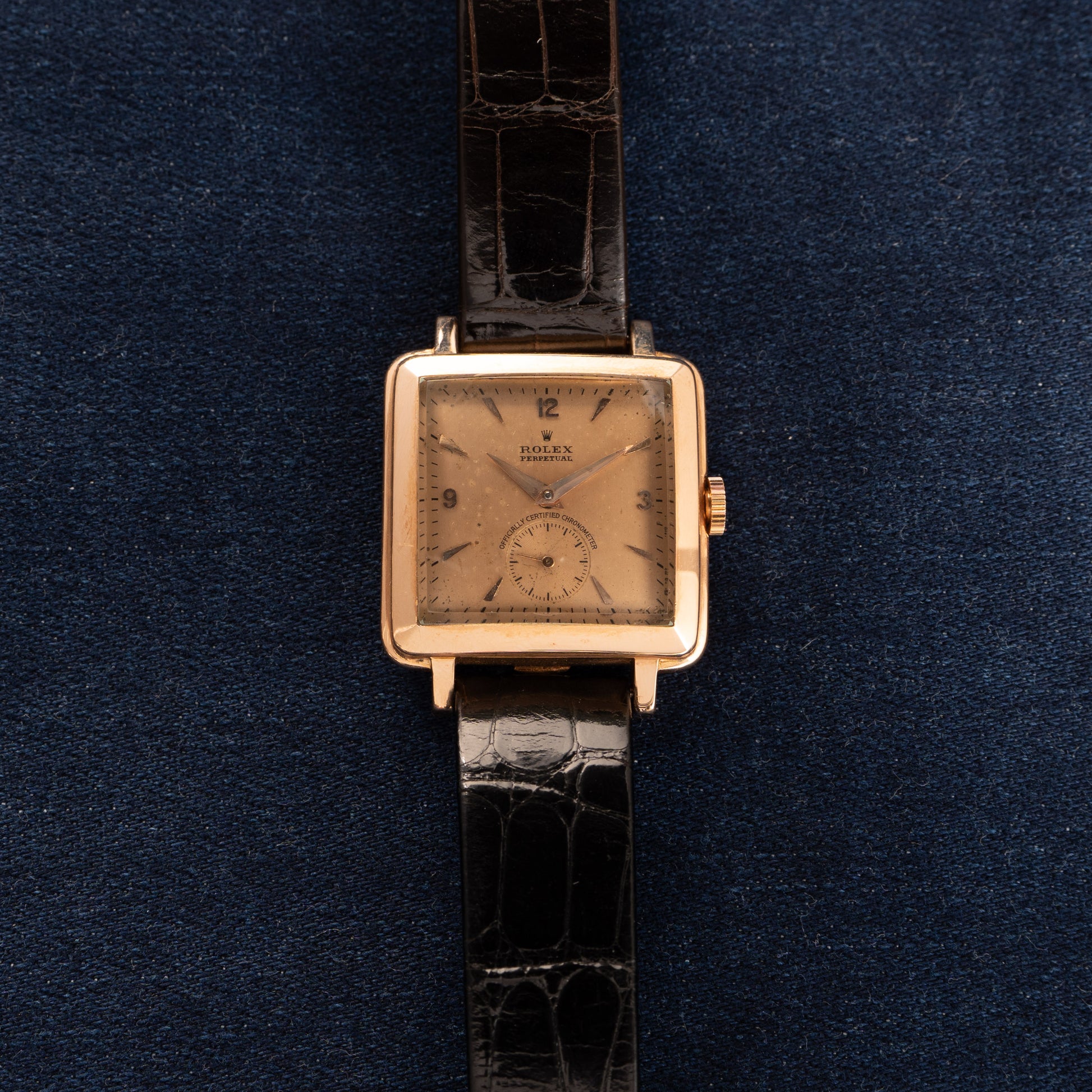 Special Rolex, square shaped in 18 kt Rose gold, monoblocco case, snap on back and crown, so called "Cioccolatino", a rare model with the automatic movement from the period. A beautiful "Rose" color dial and applied rose indexes and hands.