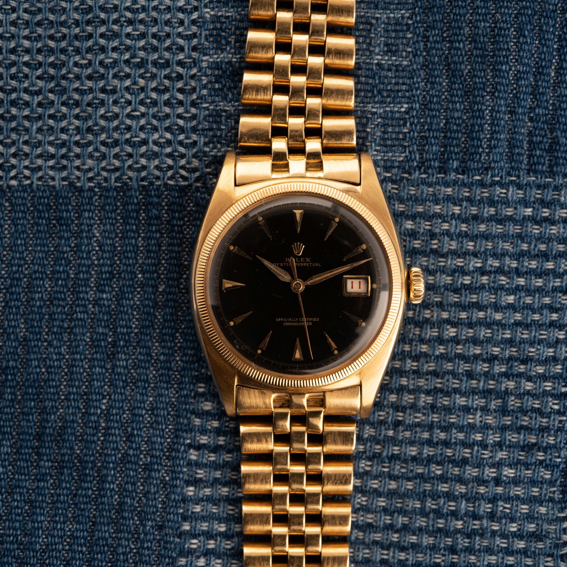 Unusual and rare "Big Bubble Back" so called "Ovettone" in 18 kt yellow gold, water resistant case, screw back with the "Jubilee" yellow gold bracelet and a beautiful black "Glossy" dial applied gold indexes and hands.