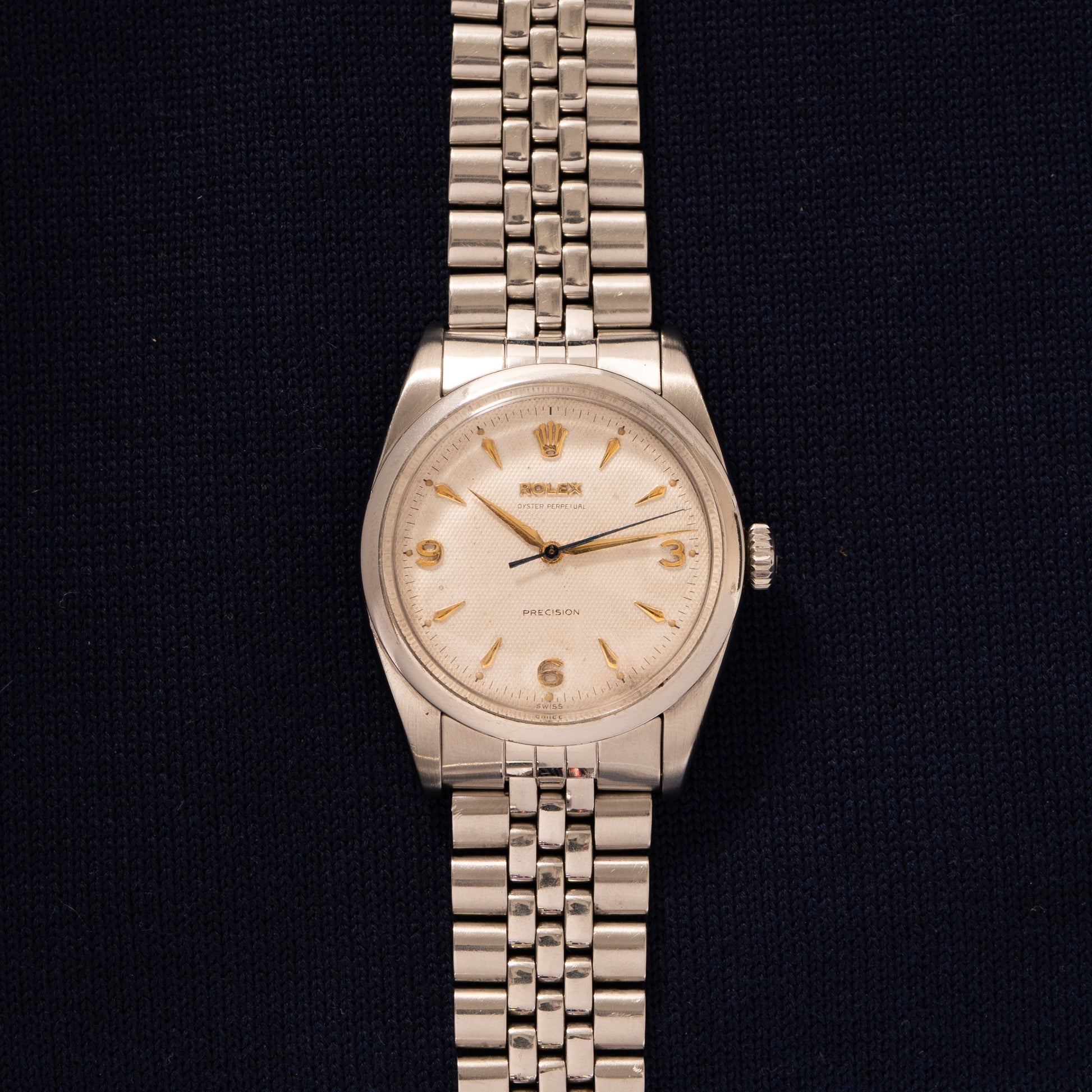 Attractive and very rare Oyster perpetual so called "Pre Explorer" or "Ovettone" in stainless steel water resistant case, screw back , in three parts, with the "Jubille" steel bracelet. Amazing & rare "Honey Comb" white dial, yellow gold indexes and hands.
