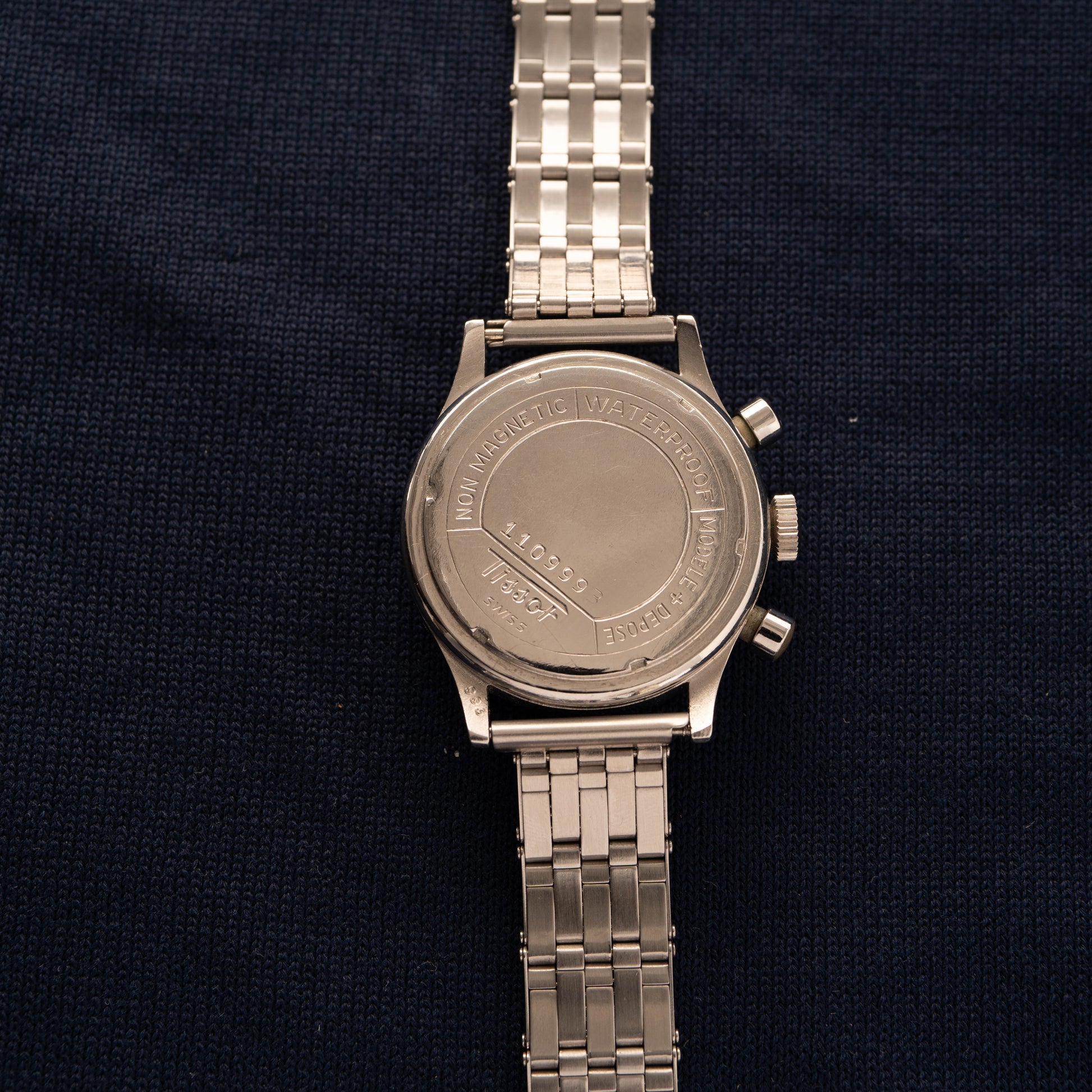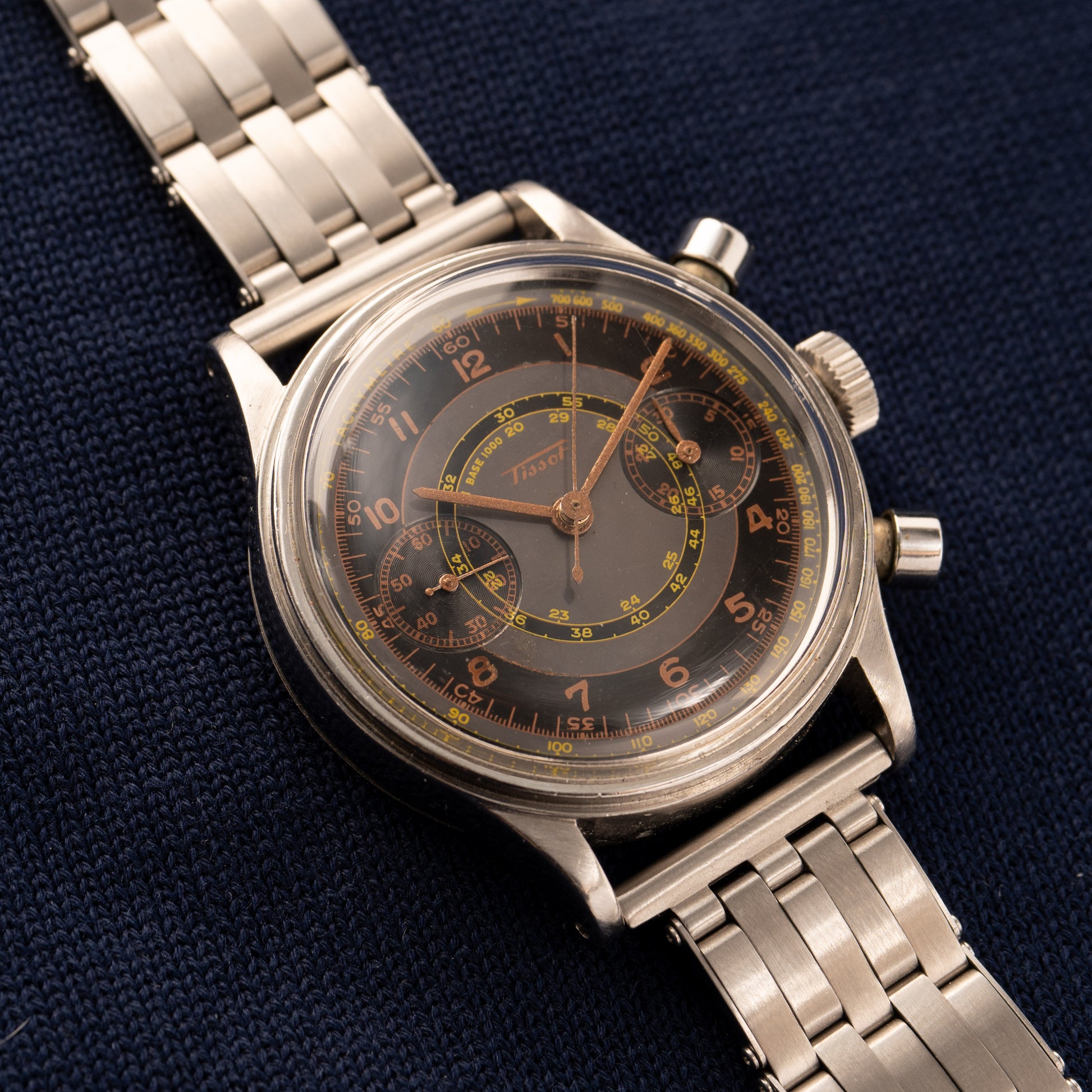 A very rare, produced in very few pieces , oversize water resistant case "Mono-blocco" in two parts, screw back and rounded pushers for the function chronograph, an sportive model very attractive for the collectors. unusual "gilt" there tone color black dial, multi-scale and dorè gold hands.